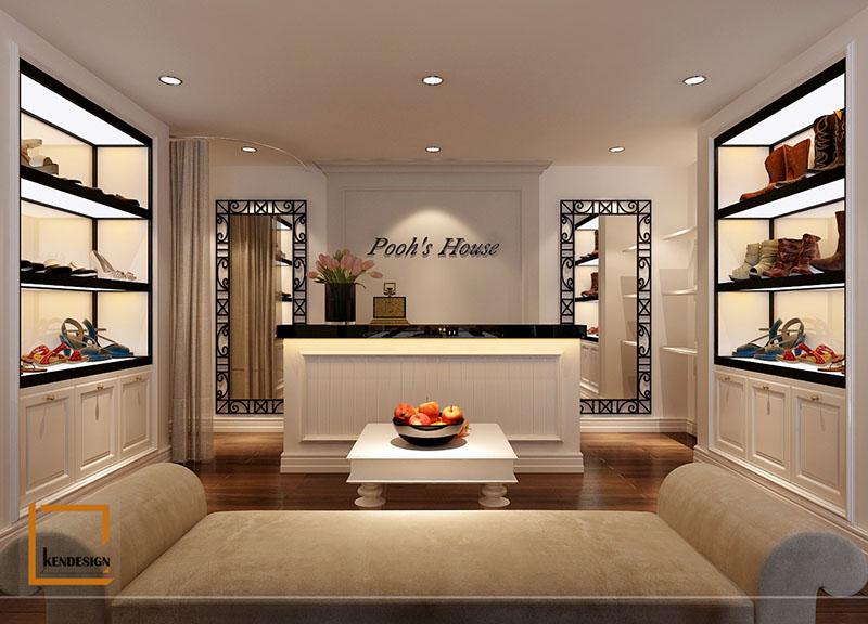 Đến với shop thời trang Pooh’s House chủ đầu tư sẽ càng cảm nhận rõ nét hơn vẻ đẹp của phong cách tân cổ điển. Với thiết kế hài hòa, nhẹ nhàng và vô cùng lãng mạn từ gam màu pastel tinh tế, thiết kế shop thời trang nữ tạo được ấn tượng với chủ đầu tư ngay từ khâu đầu phối cảnh. Với khả năng mở rộng không gian và làm nổi bật mọi chi tiết, sắc trắng trong cửa hàng khiến người nhìn ưng ý vô cùng. Đặc biệt, thiết kế shop thời trang nữ phân chia khu vực sản phẩm hợp lý, thống nhất và khoa học. Từng khu trưng bày sản phẩm riêng biệt: khu quần áo, khu túi xách, giày dép và khu trưng bày phụ kiện, nước hoa… được thiết kế đồng bộ, mang giá trị công năng thẩm mỹ cao.
