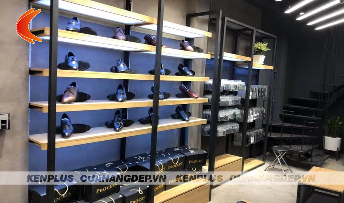 Shop thời trang Process kinh doanh chủ yếu các mặt hàng thời trang nam cùng một vài phụ kiện đi kèm như giày nam, tất. Vậy nên các thiết kế tủ, kệ trưng bày đóng vai trò vô cùng quan trọng, góp phần xây dựng thương hiệu, chủ đề shop. Vật liệu chính được sử dụng trong shop là sắt và gỗ công nghiệp, vậy nên chủ đầu tư đã sử dụng những kệ sắt gắn tường. Thiết kế này không chỉ khiến khách hàng cảm thấy thích thú vì vẻ năng động, vững chắc, tiện lợi mà còn khiến việc hạn chế về không gian được giải quyết, giúp sắp xếp bố cục không gian thống nhất và hợp lý.